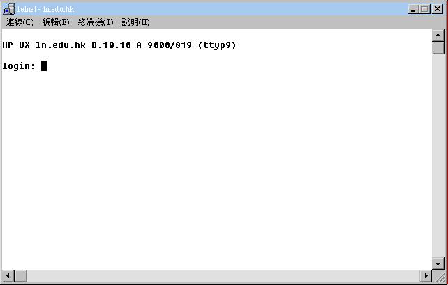 | 要登入 UNIX,你需要一個由網絡供應商提供的戶口, 通過電腦上的"Telnet" 程式登入 UNIX 系統, 鍵入 "使用 者名稱" (例如 : 你的電郵地址是 simon_lee) 和 "密碼" ( 例 如 : 你的電郵密碼是 abc123) |