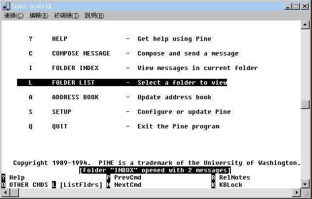| 在鍵入 "pine" 這個指令後,你會見到這個視窗 : |